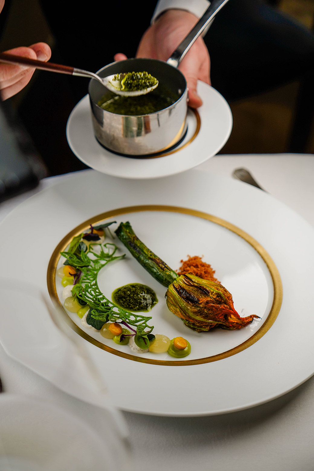 In de keuken zorgen chefs Tim Bood en Hette Hettema voor verfijnde bereidingen in de vorm van een driegangenlunch, meergangenmenu’s en uitgebreide kaart. Kundig gebakken rode mul combineert het keukenteam zeer hartig met buikspek, gerookte boter, haringkuit en doperwten.Gault&Millau