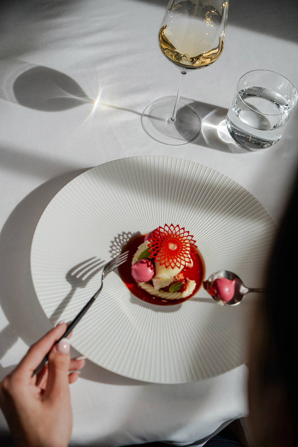 Zachte textuur van Veluws reerugfilet combineert subliem met zacht tonen van kersen, rode biet en fijne jus zacht opgepept met roze peper. Gerechten zijn detailrijk gepresenteerd met focus op harmonieuze smaakvervlechting wat een verhoogde score en derde koksmuts wettigt.Gault&Millau